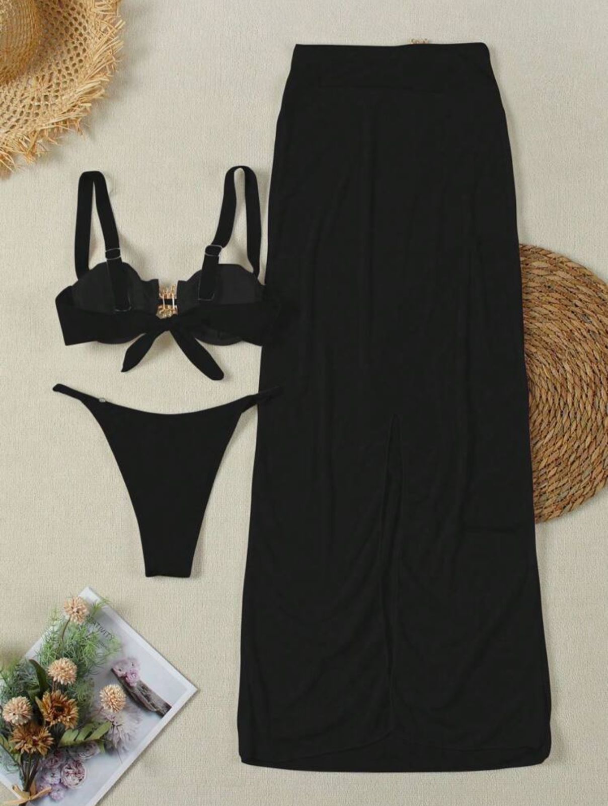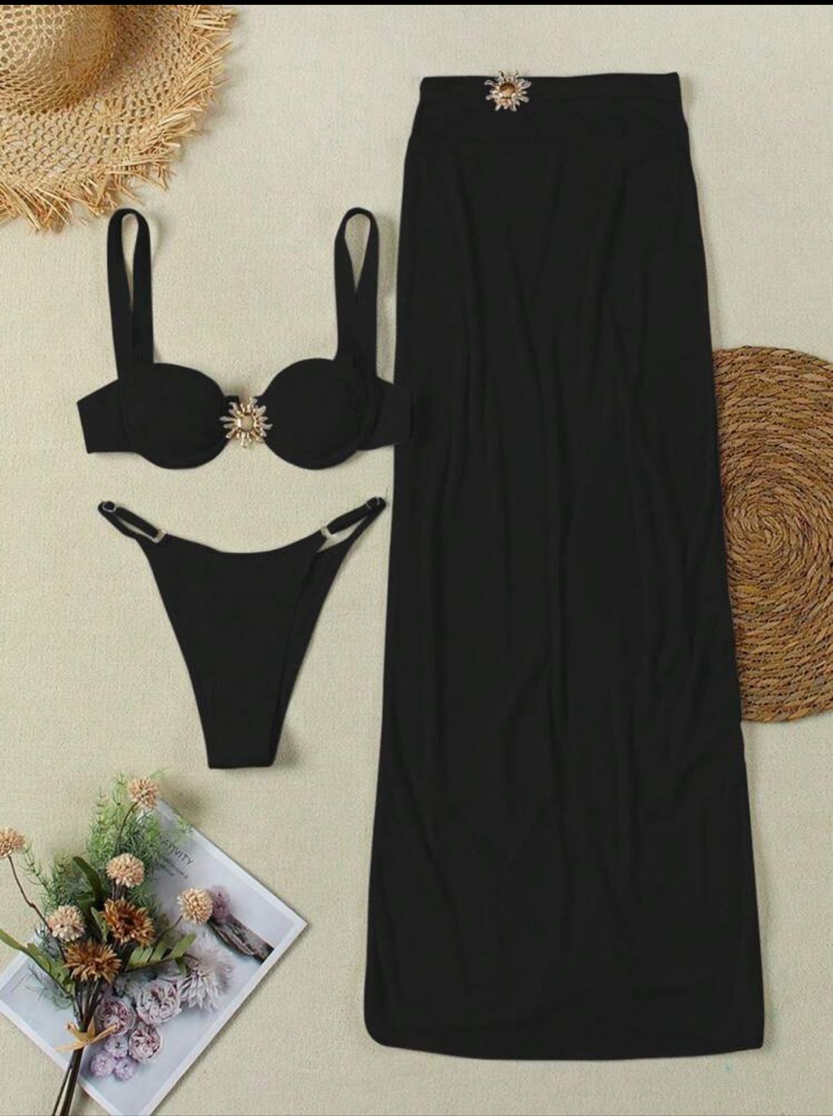 traje de baño con falda larga aplique de sol dorado son tres piezas